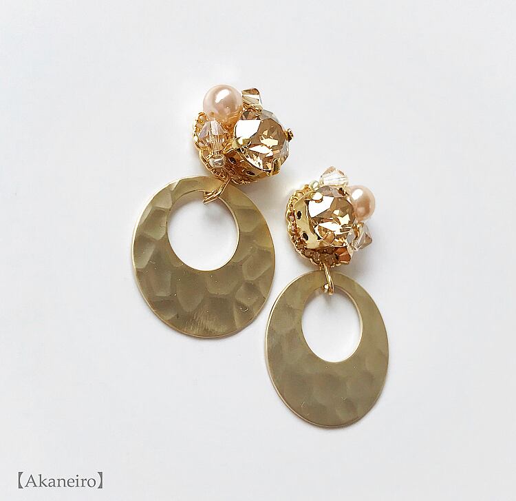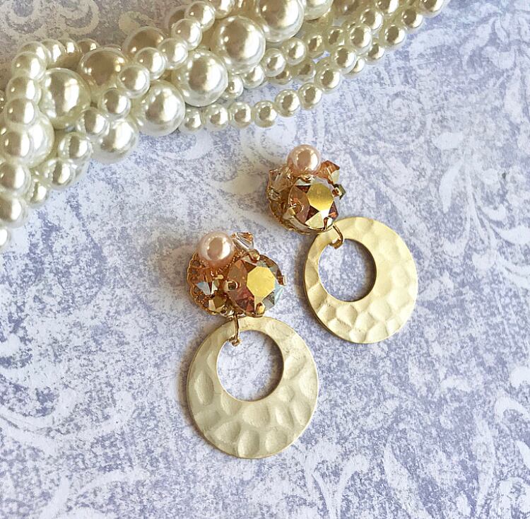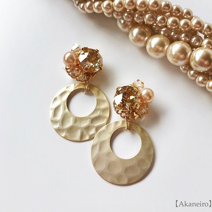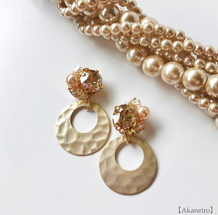 上品、キラキラ、純銀、透明感、デート、女子会、パーティ、結婚式、スワロフスキー、パーツ変更可能、ゴールド、フープ、輪、シルキーベージュ、ベージュ、淡い、