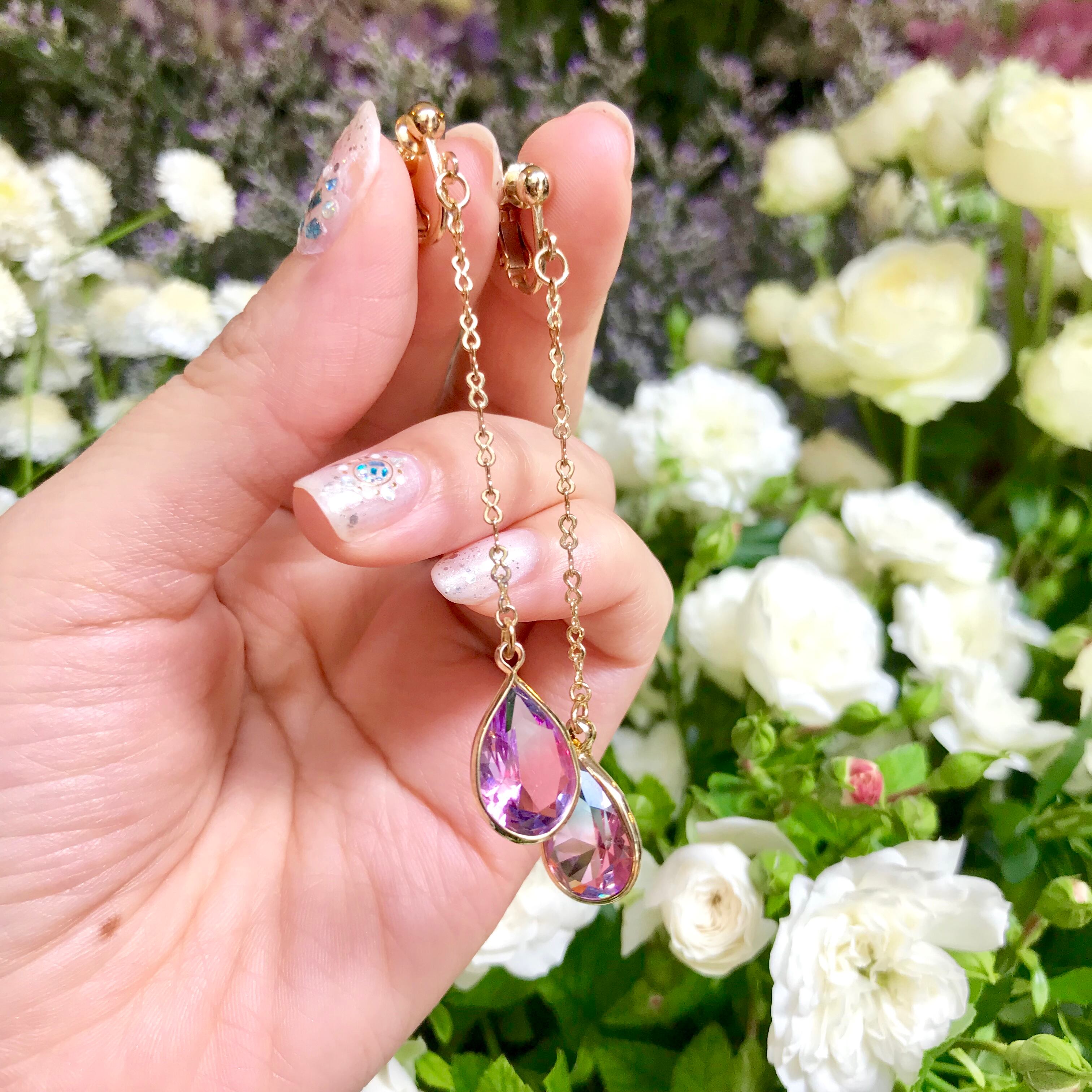 ガラスの雫が動くたびにキラキラと揺らめき、キュンとときめくアクセサリー。