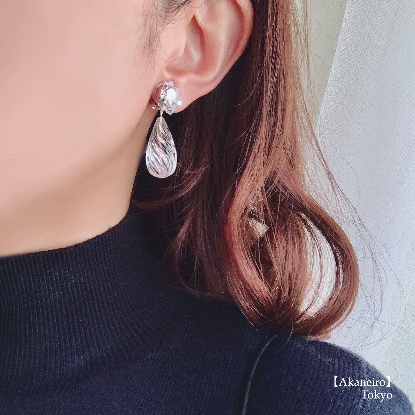 イヤリングは、痛くなりにくいと好評のゴム付きクリップ式蝶バネイヤリング金具。無料でピアス金具、樹脂ピアスにも変更可能です。