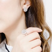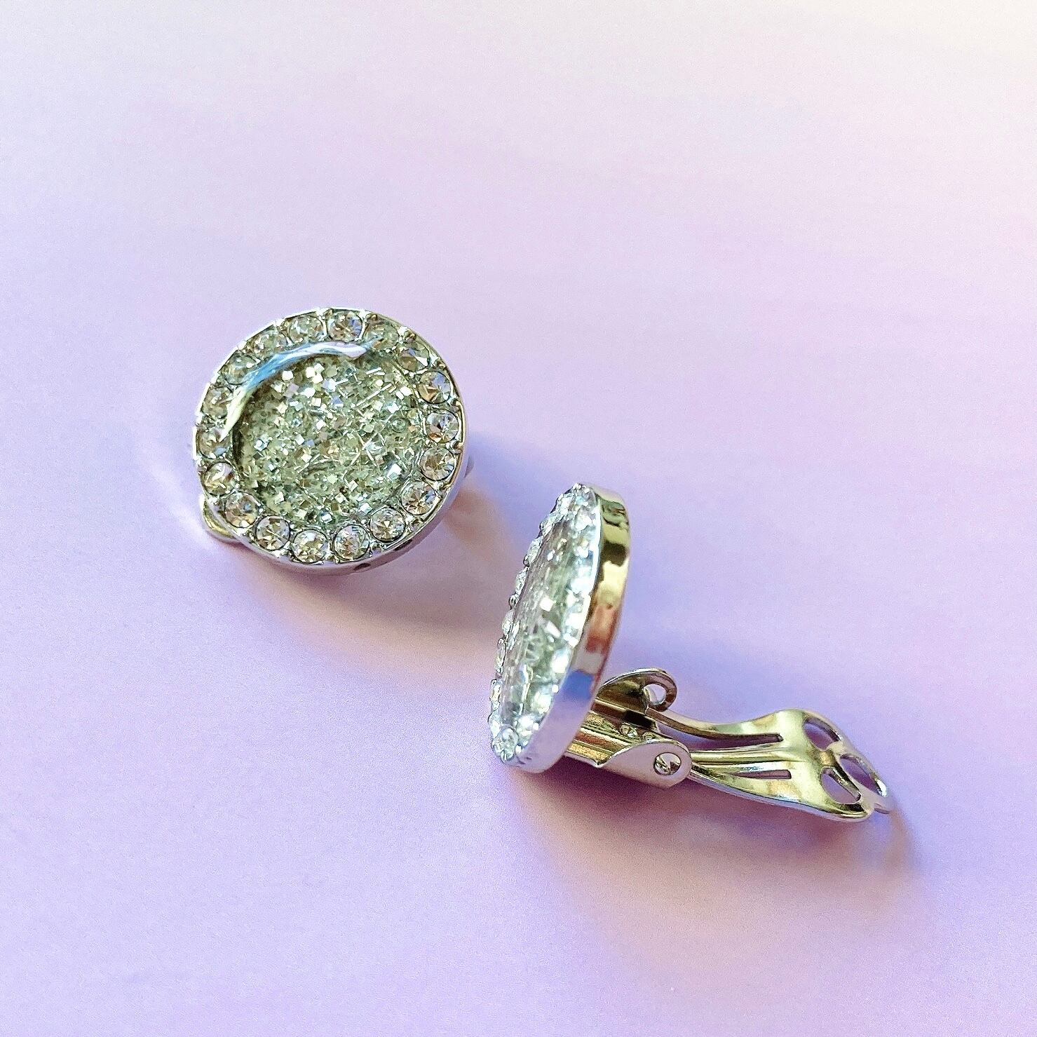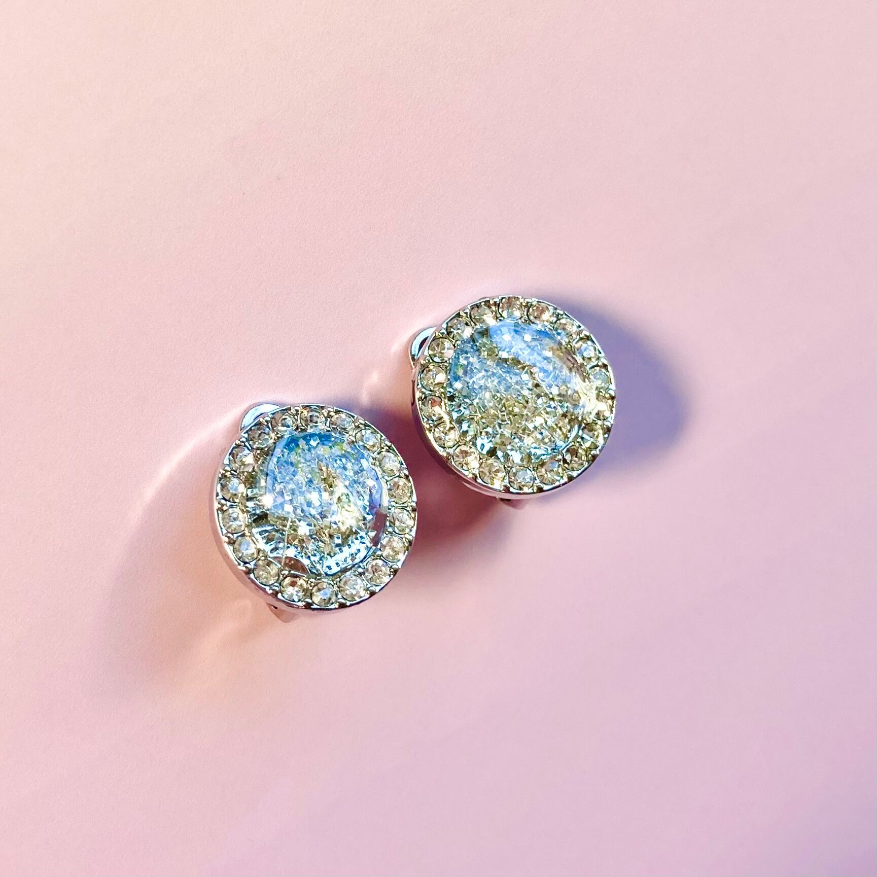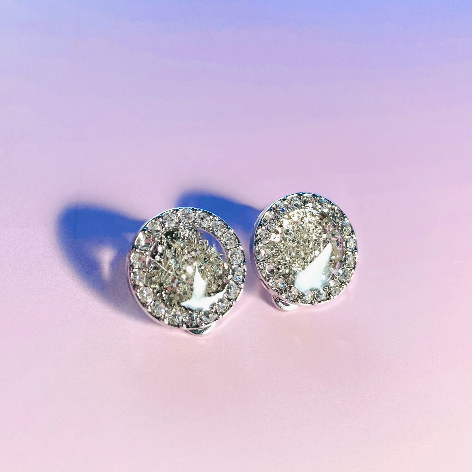 カットガラスを埋め込んだラウンド型を使用した、高級感あふれる雪の結晶イヤリング。