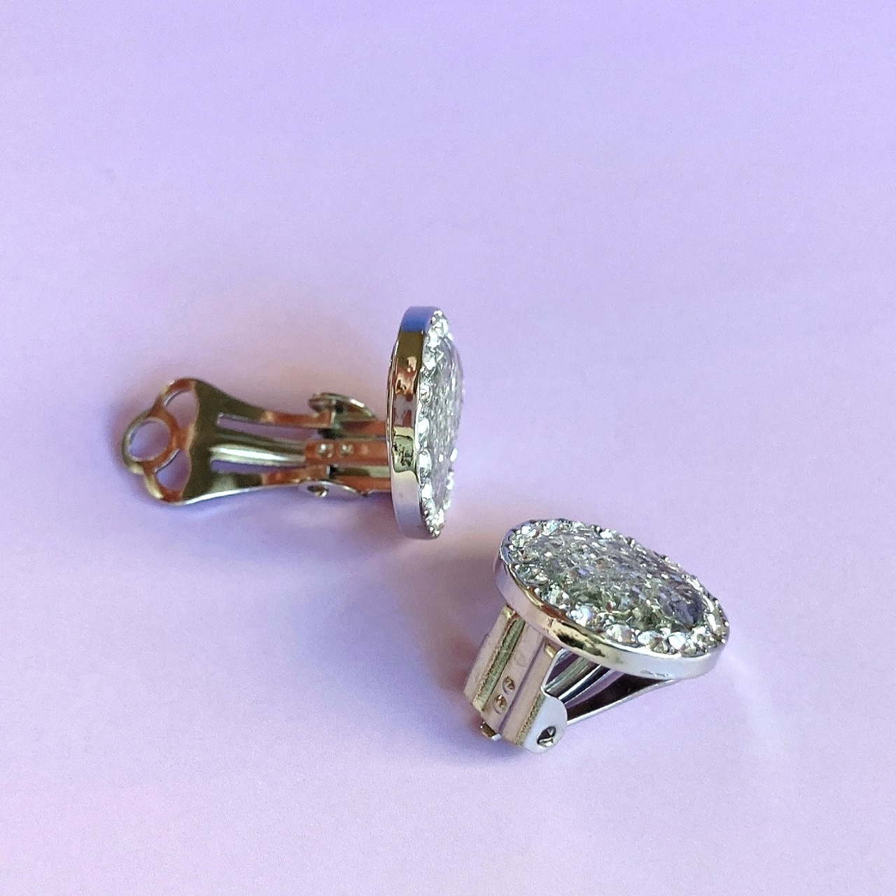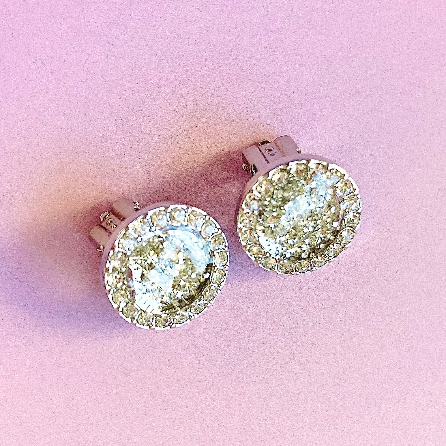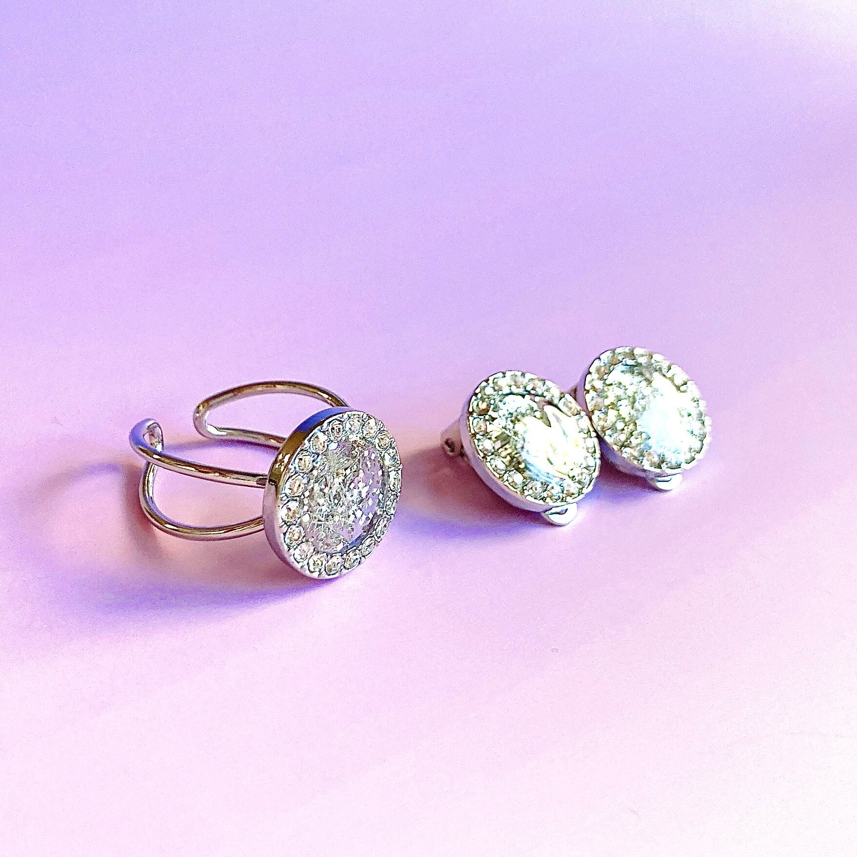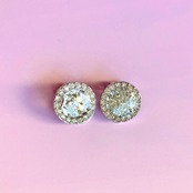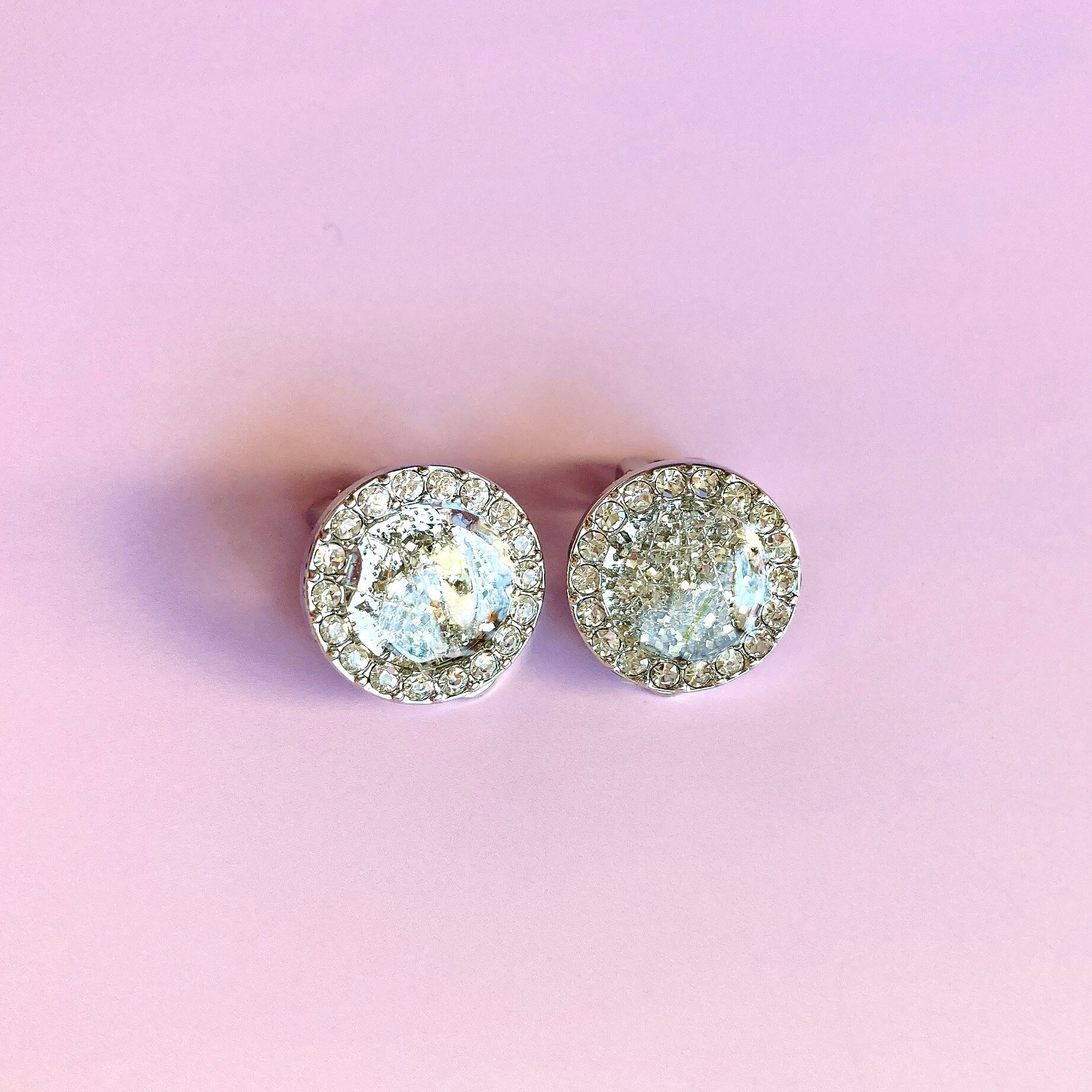 カットガラスを埋め込んだラウンド型を使用した、高級感あふれる雪の結晶イヤリング。
